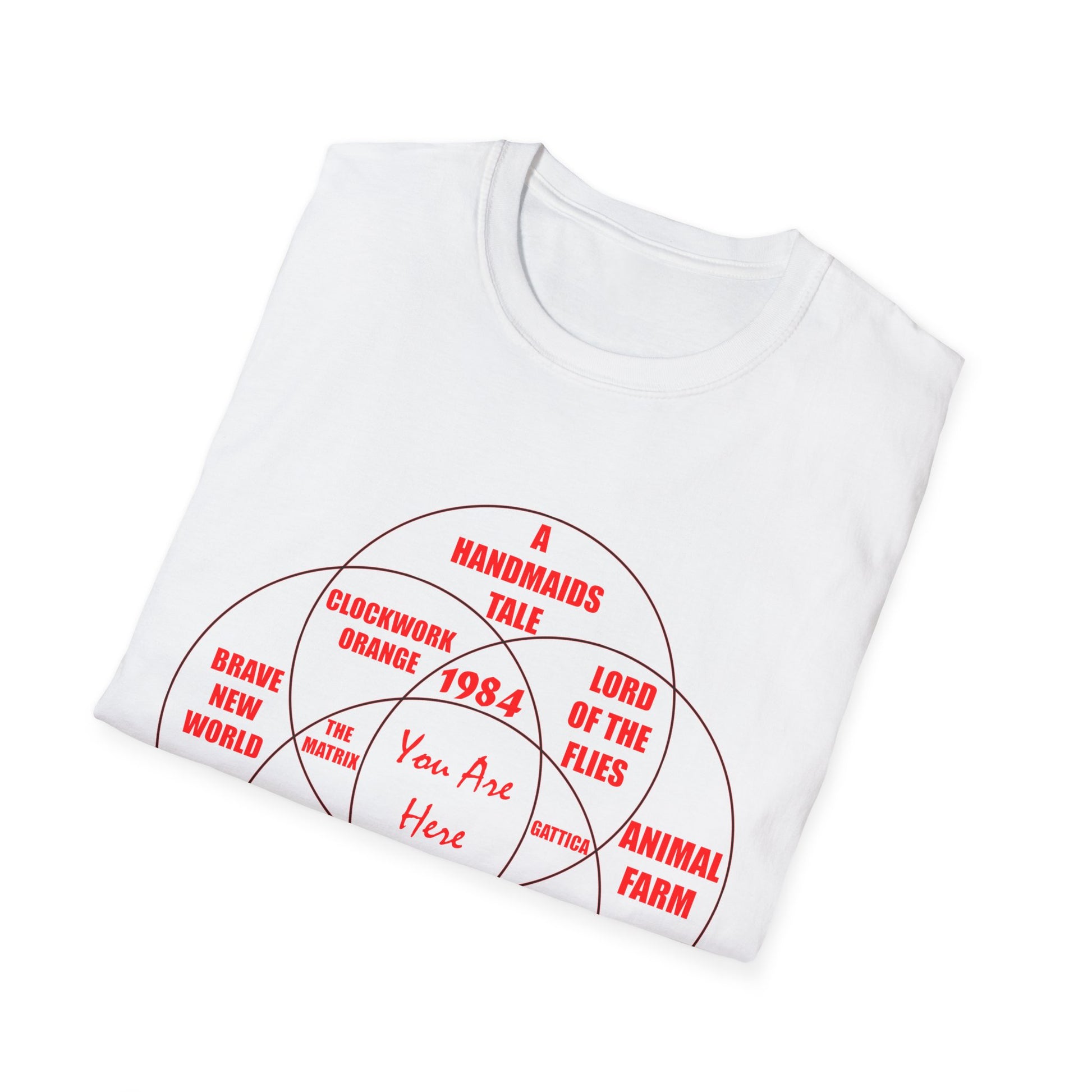 A comfortable unisex T-shirt featuring a Venn Diagram of Dystopian Literature, perfect for literature enthusiasts and book lovers. This T-shirt is ideal for casual wear and can be a great conversation starter for those passionate about dystopian novels. Suitable for adults, this T-shirt is made from durable and smooth fabric, making it a versatile addition to any wardrobe. Great for book club meetings, literary events, or as a gift for fans of dystopian fiction.
